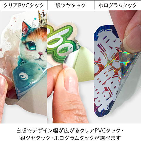 ロゴやキャラクターの形に合わせて自由な形状にカットできる、ダイカットステッカーです。 台紙ごと自由な形状に仕上がるため、個性を出したいグッズ制作にぴったりです。 用途やデザインに合わせ、5種類の素材からお選びいただけます。