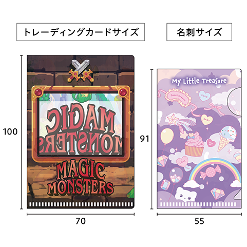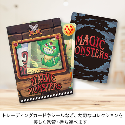 トレーディングカードやシールなど、大切なコレクションを美しく保管・持ち運べるミニクリアファイルです。フレーム風にデザインすれば、中に入れたカードが一層引き立つ素敵なデコケースに早変わり。複数柄をコレクションすれば、用途ごとに分類したり、並べて飾る楽しみも広がります。 ※名刺サイズは外寸が横55mm×縦91mmのため、同サイズの名刺は収納できません。ご注意ください。