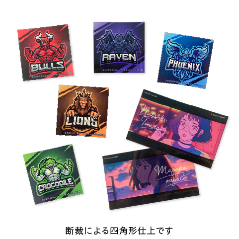 四角形仕上げのステッカー。正方形もしくは長方形仕上げとなります。 手軽なノベルティグッズやコレクション性が高いトレーディングステッカーなど、幅広い用途にご利用いただけます。 用途やデザインに合わせ、5種類の素材からお選びいただけます。