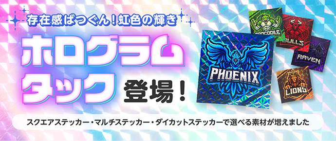 ホログラム素材が増えた、四角形仕上げのステッカー。正方形もしくは長方形仕上げとなります。 手軽なノベルティグッズやコレクション性が高いトレーディングステッカーなど、幅広い用途にご利用いただけます。 用途やデザインに合わせ、5種類の素材からお選びいただけます。